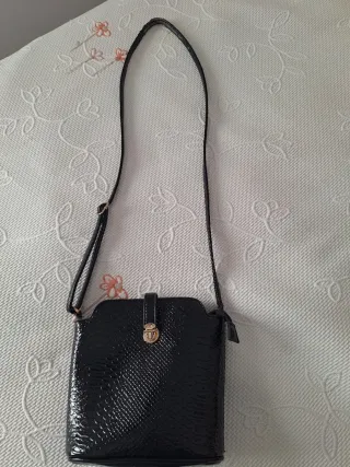 Elegante bolso negro con un diseño tipo sobre y un llamativo cierre metálico dorado. - Acabado texturizado que imita piel de serpiente. - Correa larga ajustable para llevar al hombro o cruzado. - Cierre de solapa con broche de giro.