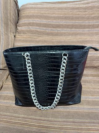Elegante bolso de mano con acabado imitación piel de cocodrilo. - Diseño moderno y versátil. - Cadena metálica para llevar al hombro. - Cierre de cremallera. - Compartimento principal espacioso.