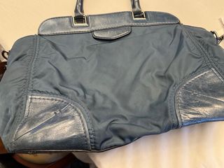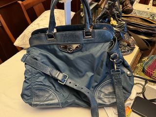 Elegante bolso Prada en color azul, una combinación de nylon y piel. - Asa de mano y correa ajustable. - Detalle metálico frontal con logo. - Compartimento principal espacioso.