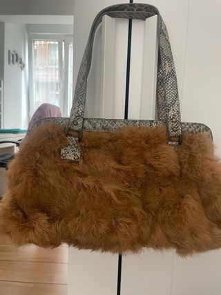 Bolso de mano con un diseño único y llamativo. - Exterior de pelo sintético en tono marrón. - Detalles metálicos en dorado. - Asas con acabado imitación piel de serpiente. 25€ cada bolso