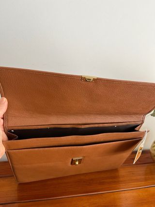 Bolso de piel unisex con un diseño clásico y versátil. Perfecto y cómodo para el día a día. Varios compartimentos, herrajes de metal. -Alto 20 Ancho 16,5 ctms - Material: Piel genuina. - Diseño unisex. ¡Sin estrenar!