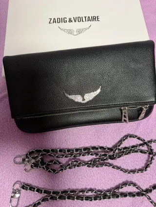 Elegante bolso de piel en color negro. - Diseño con detalle de alas plateadas. - Cierre con cremalleras. - Incluye cadena metálica.