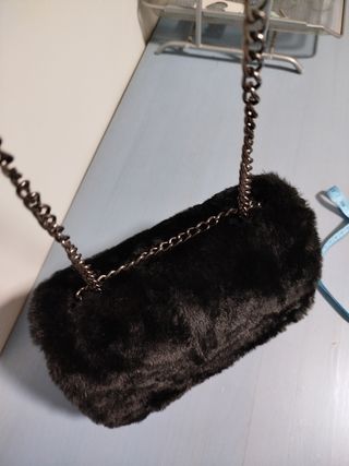 Bolso material tipo piel y la solapa con pelo negro y cadena. Tiene unos broches en los laterales que se pueden poner y quitar para hacerlo más grande o más pequeño. Tiene cremallera, un bolsillo interior con cremallera también y dos bolsillos pequeños sin cremallera. Medidas y detalles en las fotos.