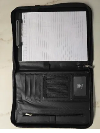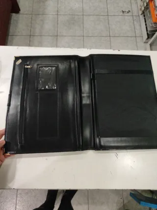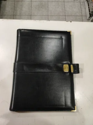 Elegante carpeta de piel en color negro, con detalles dorados. Un accesorio clásico y funcional. Con llave,y dentro se puede poner block de notas enganchado. - Diseño vintage. - Cierre con trabilla y broche dorado. - Esquinas reforzadas con detalles metálicos dorados.