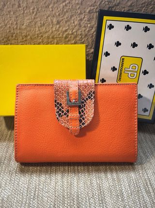 Conjunto de cartera y pitillera de piel en tono naranja. El diseño incluye detalles de piel con estampado de serpiente y hebillas metálicas. - Cartera de piel. - Pitillera a juego. - Estampado de serpiente en detalles.