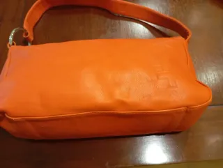 Bolso de hombro de piel en un llamativo color naranja. Su diseño es elegante y moderno, perfecto para complementar cualquier atuendo. - Material: Piel - Color: Naranja - Cierre: Cremallera - Asa ajustable - Detalle metálico en el asa