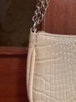 Bolso de mano con un diseño elegante y moderno. - Efecto piel de cocodrilo. - Cadena plateada para llevar al hombro. - Cierre de cremallera. - algunos signos de desgaste pero no se notan. ☺️
