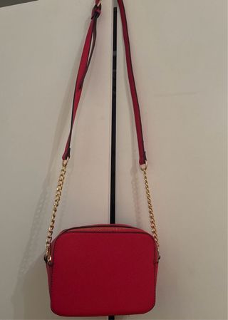 Bolso de color rojo con un diseño moderno y elegante. Perfecto para llevar tus esenciales. - Correa ajustable combinada en piel y cadena dorada. - Cierre principal con cremallera. - un bolsillo en el interior de cada cremallera