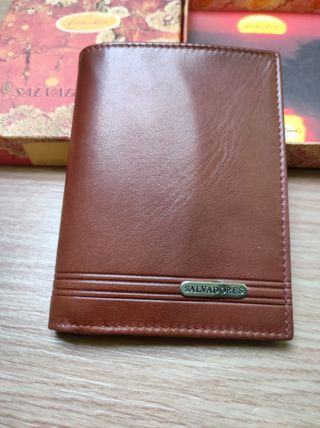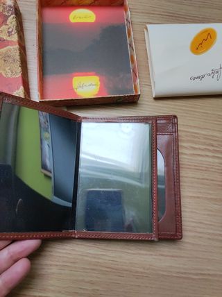 Billetera de piel con diversos apartados interiores. No tiene bolso para monedas. Medidas: 8,5 cm de ancho, 11 cm de largo