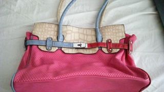 Bolso de mano en color rosa con un diseño texturizado. Bolso Rosa y beige. de polipiel, plástica, Efecto piel de cocodrilo en la parte superior beige y en la parte inferior rosa, tiene dos asas superiores y una correa decorativa delantera con secciones en azul claro y rojo, que se cierra con una hebilla metálica. Las asas tiene pequeños defectos, puedo hacer fotos si alguien está interesado- - Asa de mano. - Cierre de cremallera. - Bolsillo exterior con cremallera.