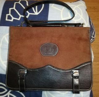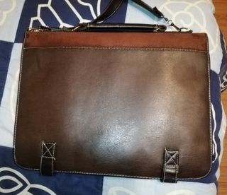 Maletín cartera en piel legítima a doble cara. En perfecto estado, sin un roce. Dos cierres de seguridad, asa de mano, correa de hombro extraíble. Compartimento con cremallera en el interior de la tapa, 3 amplios bolsos, 1 pequeño y 5 para elementos de escritura. Medidas 40x30 cm.