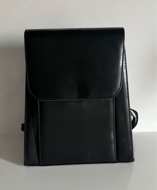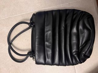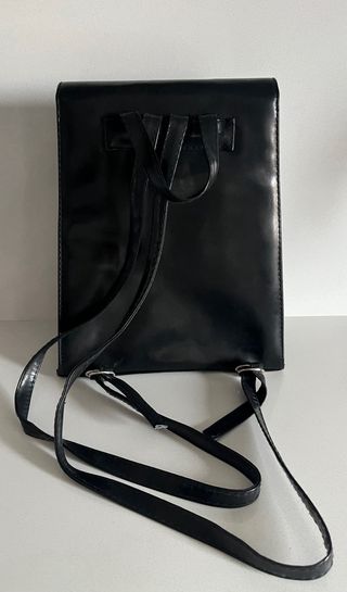 Bolso tipo mochila de piel sintética en color negro. Cierre de solapa. Correas ajustables. Usado en dos ocasiones, como nuevo.