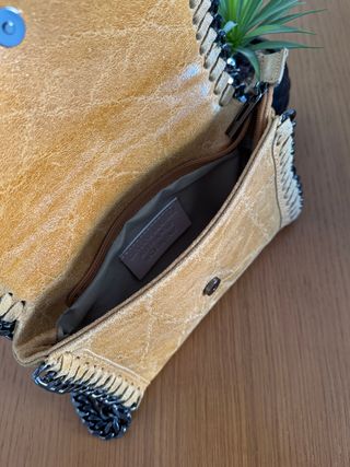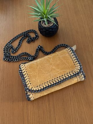 Pequeño bolso italiano de piel. Bandolera de cadena, no regulable. Color mostaza. Medidas: 21x14x4 cm. Nuevo, sin etiqueta (nunca la tuvo).