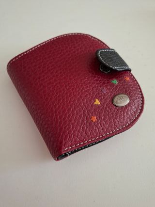 Monedero de piel con un diseño encantador y detalles de corazones de colores. - Procedente de cierre de negocio. - Cierre de botón a presión. - Detalle de costuras blancas. - Adornos de corazones y estrellas. - Insignia metálica con logo. - Medidas: 10 x 10