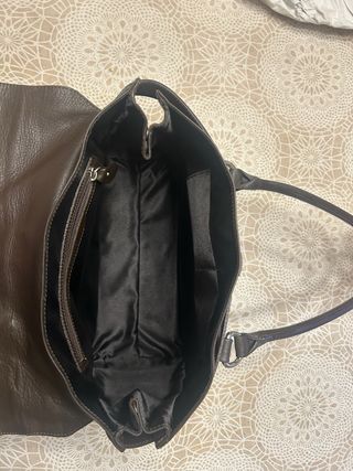 Bolso de piel sintética en negro, con cuatro compartimentos interiores de tácto aterciopelado y color marrón. Muy útil como portadocumentos. Dimensiones: 32x25 cm.