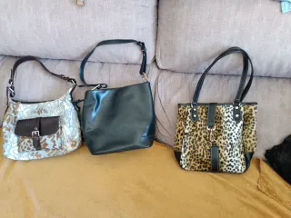 Tres bolsos de piel con diferentes diseños. - Bolso negro. - Bolso con estampado de leopardo. - Bolso con estampado floral y detalles en piel.