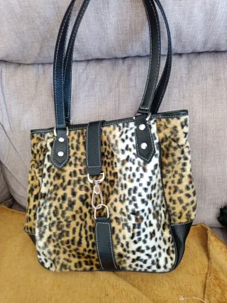 Bolso con un diseño único de piel de vaca y detalles en negro. Presenta una llamativa aplicación de cruz adornada con pedrería. - Estampado de vaca. - Adorno de cruz con pedrería. - Ribetes y asas en negro. - Medidas aprox. 36 x 25 x10 - Cierre con clip imantado en la cruz - No tiene bolsillo interior - Forro en su interior - Tejido de pelito muy fino