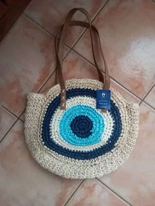 Bolso de paja con un diseño circular y un llamativo estampado de ojo turco en tonos azules y beige. - Material: Paja - Diseño: Ojo turco - Forma: Redonda - Asas: Piel