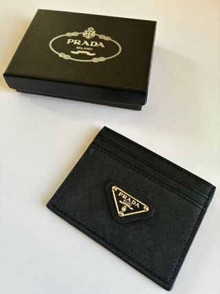 Elegante portatarjetas de la marca Prada. - Diseño en color negro. - Detalle metálico dorado con el logo triangular de Prada.