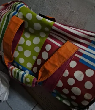 - Estampado de rayas y lunares. - Asas de color naranja. - Material de tela resistente.