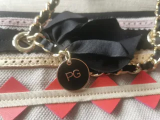 Bolso shopper de Purificación García con un diseño llamativo y original.Esta impecable. Muy combinable - Combinación de cintas y tejidos en diferentes colores. - Detalle de cadena dorada. - Adorno de lazo negro con charm. - Base con detalles de rombos rojos.