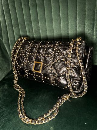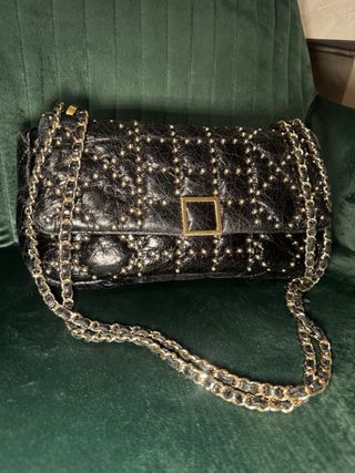Bolso de piel de Purificación García con un diseño acolchado y tachuelas doradas. Como nuevo. Practicamente sin usar - Cierre con solapa y detalle metálico. - Cadena dorada para llevar al hombro o cruzado. - Acabado brillante.