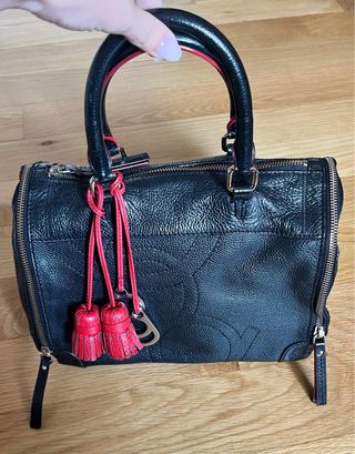Elegante bolso de mano en piel de Purificación García. - Diseño bowling. - Detalles en color rojo. - Incluye los adornos de flecos y PG. - Logo grabado en relieve. - Piel. - Dimensiones: 28 x 20 x 20 cm.