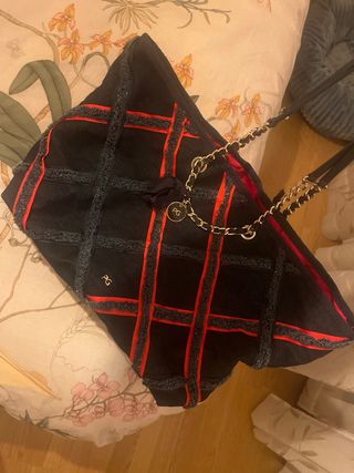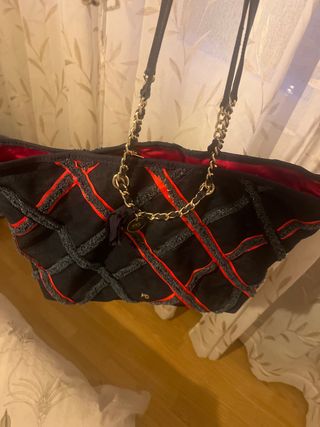 Bolso de Purificación García con un diseño original. - Tejido vaquero. - Detalles en cinta roja. - Asas de cadena dorada.