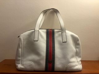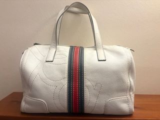 Bolso de mano original “Purificación García” , estilo bowling ,con un diseño elegante y moderno. - Elaborado en piel. - Detalle de tres bandas verticales en contraste: roja, verde y azul marino. - Costuras visibles en hilo blanco. - Cierre con cremallera - Dos asas cortas superiores. - Placa metálica con logo en la parte frontal.