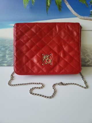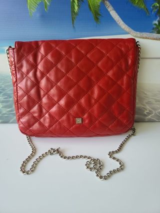 Bolso de Purificación García en piel color rojo con cadena dorada. Se puede usar como Bandolera también. Tamaño mediano. Usado y con detalles de uso pero aún perfecto para otra vuelta! Medidas aproximadas:28cm largo x 22,5cm alto x 5cm fondo