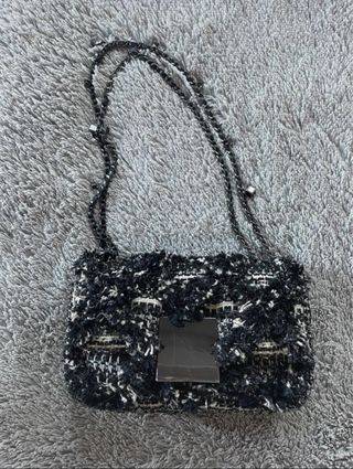Precioso bolso bandolera de Purificación García. Es de color blanco y negro, con un diseño elegante y sofisticado. - Asa larga de cadena entrelazada con detalles en negro. - Cierre de solapa con broche oculto. - Tejido de tweed en blanco y negro. esta en buen estado, tiene algunas marcas de uso, como las que se muestran en las fotos.