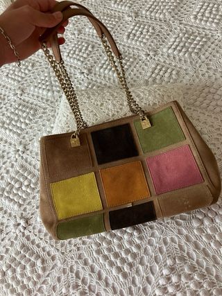 Bolso de mano con diseño patchwork de la marca Purificación García. - Combinación de ante en varios tonos. - Cadena dorada para llevar al hombro. - Cierre con solapa.