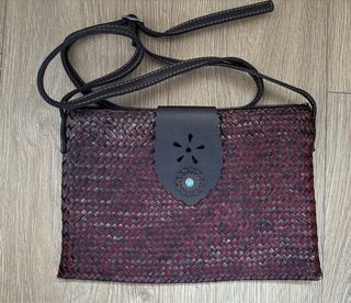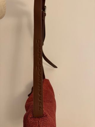 Bolso de Adolfo Dominguez con un diseño tejido. - Material exterior tejido. - Cierre de cremallera. - Correa de cuero. - Color rojo y marrón. Bolso tejido rafia y correa de piel grabada con la marca. Totalmente nuevo. Sin uso. Puede apreciarse tanto en el exterior como en el forro interior.