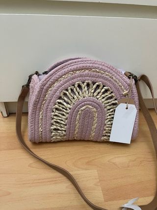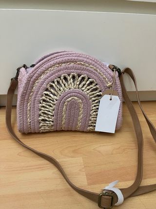 Bolso de rafia con un bonito diseño de arcoíris en tonos beige y rosa. Perfecto para añadir un toque bohemio a tu look. - Material: Rafia y tela. - Cierre de cremallera. - Correa ajustable.