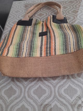 Precioso bolso de hombro a estrenar. Es de color beige y rojo, con un diseño de rayas. Medidas: ancho base 28 cm, alto 23 cm más 25 de las asas, ancho alto 34 cm , ma base tiene un finde de 8 cm. - Asa de mano y asa bandolera. - Cierre de cremallera. - Material de rafia con forro resistente