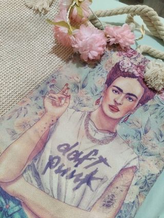 Precioso y grande bolso de rafia boho en tonos beige y rosa. Ideal para el verano, la playa... - Diseño con la imagen de Frida Kahlo al estilo "punk". - Asa de cuerda gruesa. - Detalles de flecos. - Sin usar. - ¡Muy original!