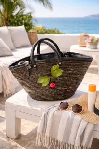 Bolso Capazo Rafia con Cremallera Negro/Marrón