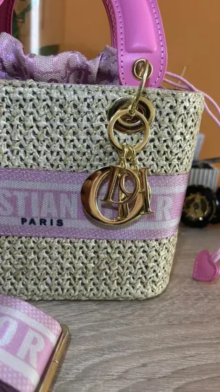 Bolso de mano y bandolera con detalles en rosa y tejido de rafia. - Correa de bandolera con logo Christian Dior Paris. - Charm Dior dorado. - Cierre de cordón.