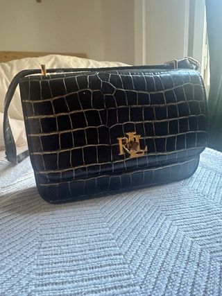 Elegante bandolera con acabado de piel de cocodrilo. - Diseño en color negro con detalles dorados. - Logo de Ralph Lauren en la solapa.