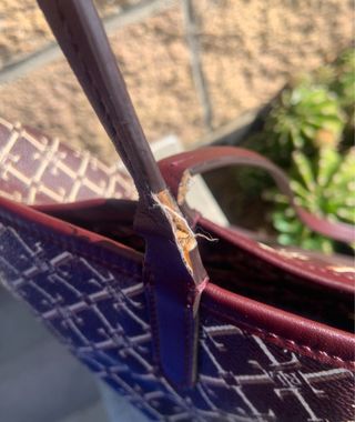 Tiene pequeños desperfectos por el uso, como la piel de la cremallera que ha saltado. Es de loneta con asa larga que se puede sacar y poner y otra corta fija