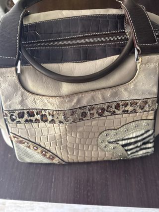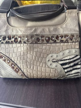 Bolso de mano con un diseño patchwork muy original. - Combinación de texturas: piel lisa, efecto cocodrilo, pitón y estampado animal. - Detalles metálicos y tachuelas. - Cierre de cremallera superior. - Asas de mano y correa ajustable.