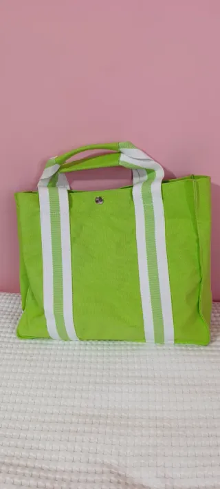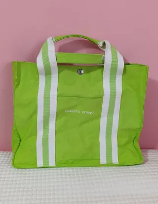 Bolso tote de la marca Roberto Verino en un llamativo color verde. - Diseño con asas de tela a rayas blancas y verdes. - Bolsillo exterior frontal. - Cierre de botón a presión. Ver medidas en fotos Lleva sin uso más de 20 años