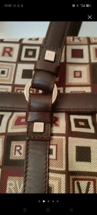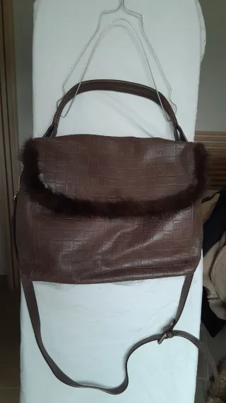 Bolso de mano y bandolera en color marrón, con un diseño grabado de las iniciales RobertoVerino de piel y ribeteadosde V. - Adorno de pelo en la solapa. - Correa bandolera ajustable. Se podría vender como nuevo no tiene ninguna señal de uso, con su bolsa guardapolvo