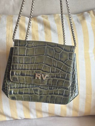 Bolso de mano con un diseño texturizado y un toque retro. - Acabado imitación piel de cocodrilo. - Detalle de logo metálico RV en la solapa. - Cadena metálica para llevar al hombro.