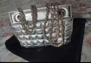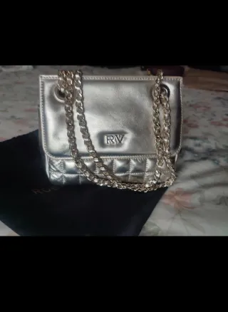 Bolso pequeño de piel de la marca Roberto Verino, en un elegante color plata. Es un accesorio sin estrenar, perfecto para añadir un toque de distinción a tu look. - Diseño acolchado. - Cadena metálica dorada. - Cierre de solapa.