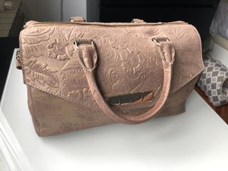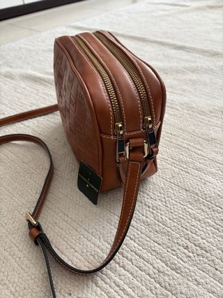 Bolso de piel con forro de ante. Color Camel. Logo de la marca. Cierre con tira de piel y clip. Asa de mano y asa bandolera regulable. Medidas 17x14x7 cm. Regalo bolsa para guardar ** Nuevo ** Precio original 160€ *** Precio no negociable