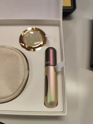 Conjunto de accesorios de la marca Tous. - Dos bolsas de regalo rosas. - Un estuche plateado. - Dos cajas redondas rosas. - Una caja redonda color beig