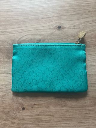 Monedero de la marca Tous con un diseño estampado. - Color principal: verde azulado. - Detalle del tirador de la cremallera en tono dorado.