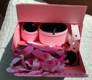 Cajas, bolsas de papel, pegatinas, sobre y caja de embalaje, todo original de Tous. 3 cajas redondas rosa (1 mediana, 2 pequeñas) con cascabel 8 bolsas de papel pequeñas y 2 grandes (rosa, fucsia, gris) 9 pegatinas 1 sobre rosa pequeño 1 caja rectangular de embalaje (usada) La última foto es la actualizada!!