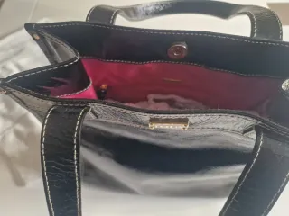 Bolso Tous de charol negro con costuras blancas. - Asa de mano. - Incluye funda guardapolvo. - Detalle de logo metálico en el asa.